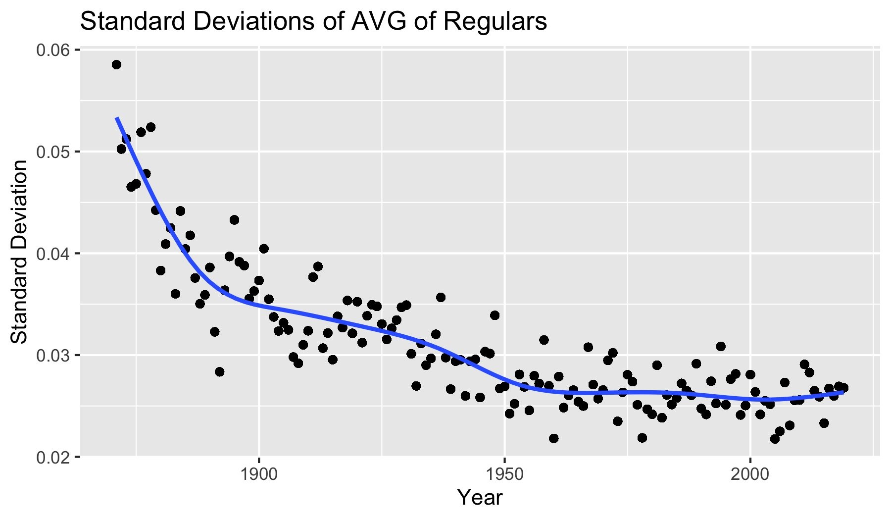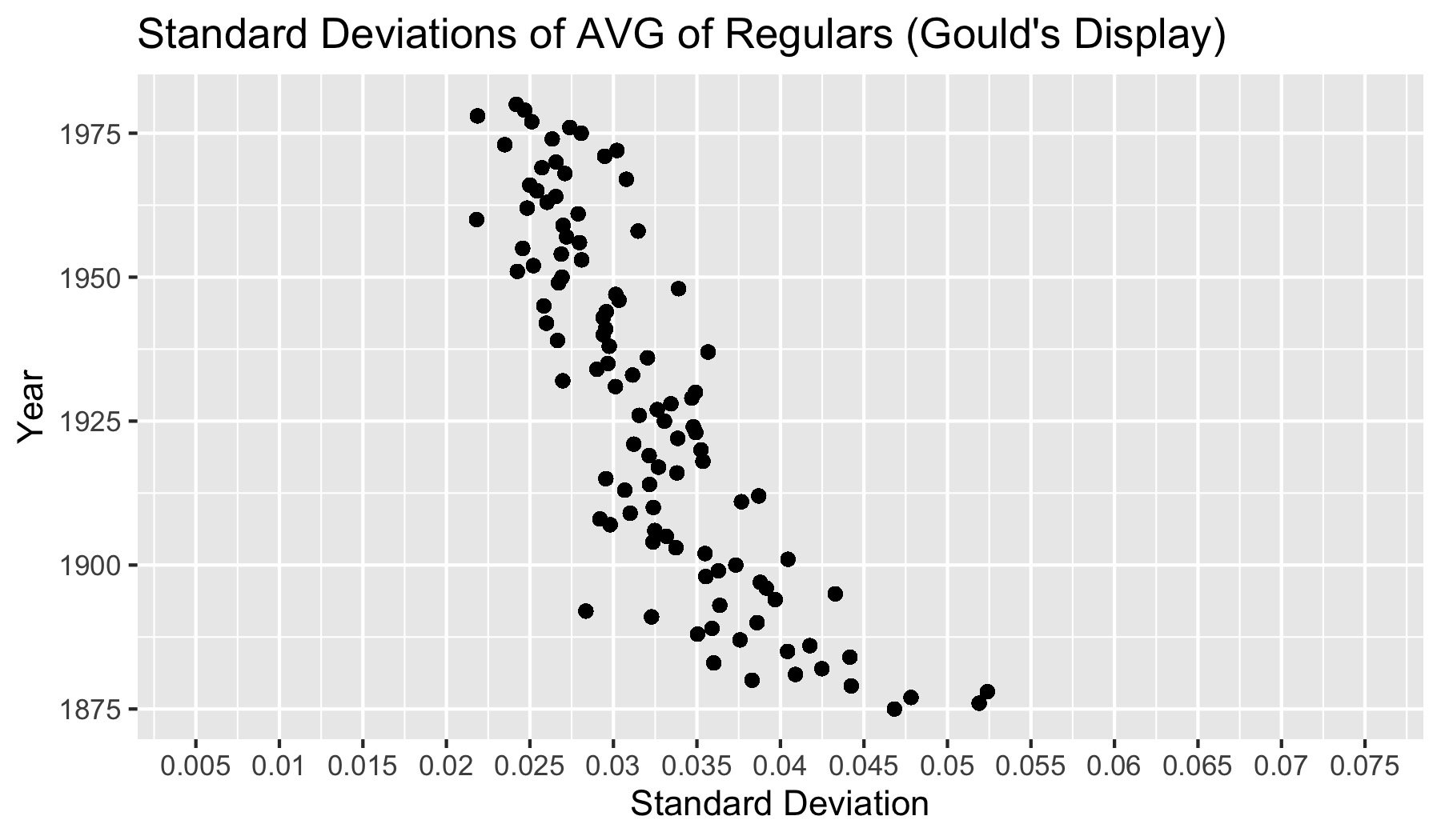 With this updated version, it’s a lot easier to see what’s going on here. The standard deviation of batting averages (of regular players) is much higher before 1900, declines over the course of the 20th century, and then stabilizes. For Gould, this data is a demonstration of the idea that ‘complex systems equilibrate as they improve’ (162).